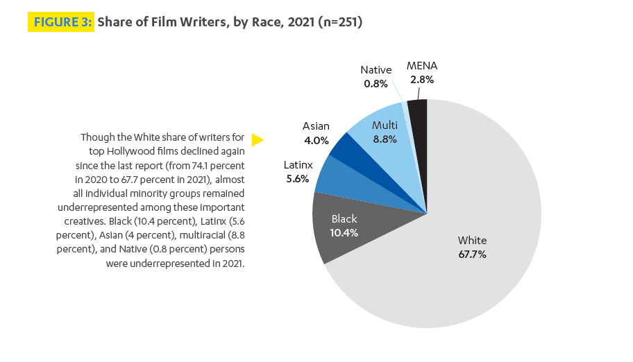 It was fascinating to learn that streaming releases are more diverse than theatrical releases (64% of streaming casts had more than 30% diversity versus theatrical films which had 57% diverse casts). This finding demonstrates the social responsibility and consumer need of streamers to provide diverse narratives for its audiences. For instance, the two most watched streaming releases of 2022 were Turning Red and Encanto. An indicator of having a diverse cast is also dependent on prioritizing the voice of female writers and writers of color. Below are two statistics from the report that stood out to me in relation to how these diversity demographics play a role for writers: